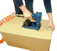 Salco RF-888 air-operated top carton roll stapler. Similar to CCC RC1000T.  Intended for securing the top flaps of corrugated boxes after filling. Meets the demands of a medium-to-heavy duty production applications. Uses 888/15, 888/18 1M roll staples, leg lengths 5/8" and 3/4".